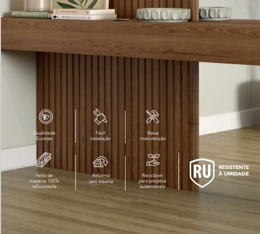 Além de práticos e versáteis, os Ripados Eucatex oferecem 10 padrões diferentes, com 7 madeirados e 3 unicolores. Assim, você combina cada detalhe do ambiente com mais estilo e sofisticação.